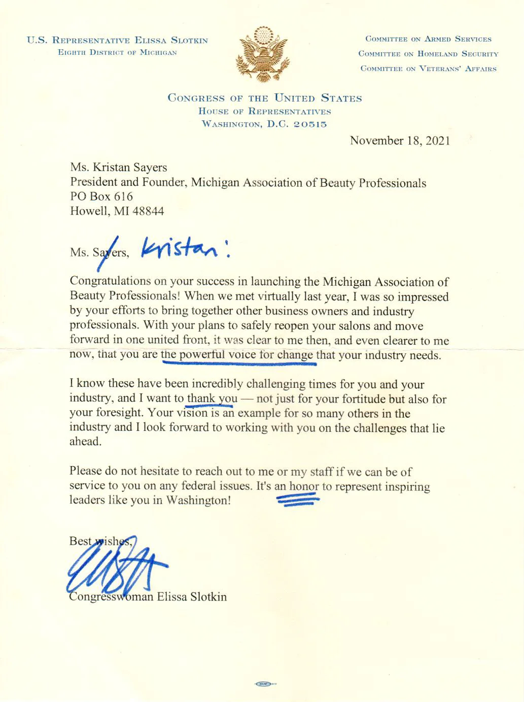 - Letter From Congresswoman Elissa Slotkin To Kristan Sayers