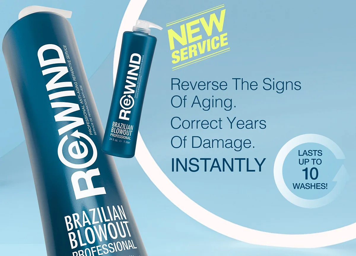 Brazilian Blowout REWIND is a NEW in-salon service that instantly reverses the signs of aging in your hair. With its technology, it is able to immediately correct years of damage to both mature and chemically treated hair. Add to any service for instant results that last up to 10 shampoos!
